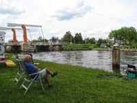 ’s Middags nog een poos samen aan het water gezeten. Simon met een hengel en ik met de beentjes omhoog en de E-Reader in de hand, heerlijk. Af en toe komt er een boot voorbij, sommigen gaan met een boog om de dobber heen, anderen hebben de blik op oneindig en het verstand op nul en zien helemaal geen dobber! Met de visvangst is het droevig gesteld, alleen de kleuters laten zich vangen. Na het eten nog even naar Workum voor een ijsje, het wordt donker boven ons en we gaan snel terug naar de camper maar redden het net niet om voor de bui binnen te zijn!